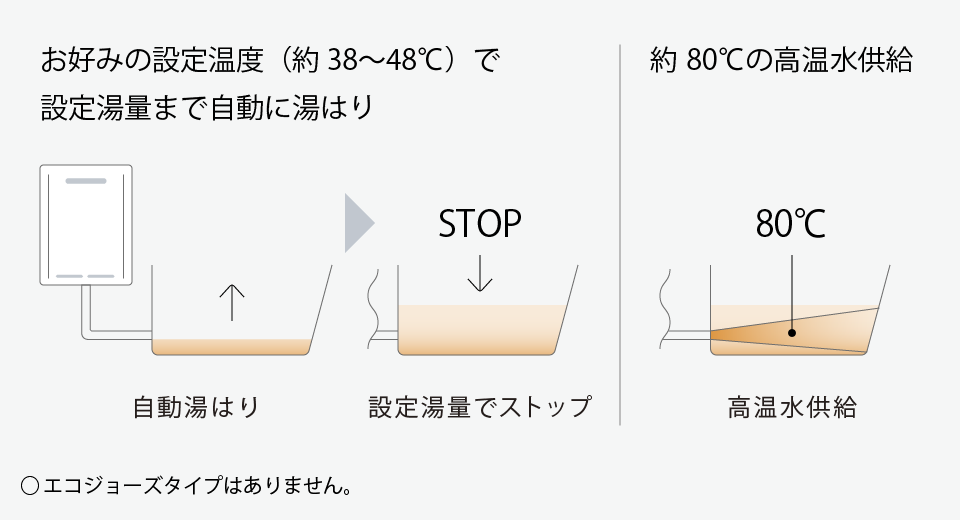 約80℃の高温水でおいだき気分1台でキッチンやシャワーなどの給湯ができ、自動湯はり機能を備えたタイプ。約80℃の高温水を供給し、おいだき気分が味わえます。