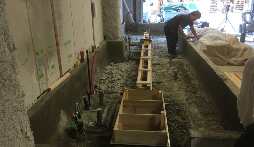 大阪府大阪市浪速区某店舗改装工事(厨房、グリストラップ設置及び配管工事)スケルトン状態の大阪府大阪市浪速区某店舗厨房区画にまずはグリストラップを設置(プレパイ工業超浅型グリストラップTOSC-1050側溝流入式)