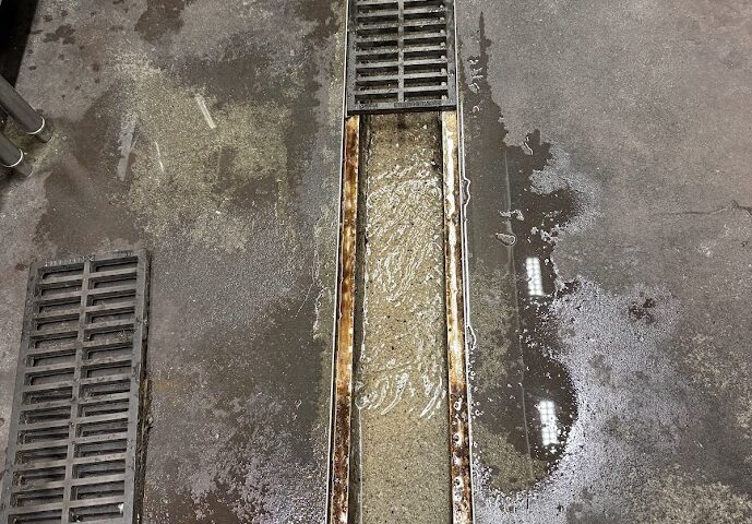 厨房のシンクを流すと排水が溢れてくると連絡を受け厨房内排水管洗浄