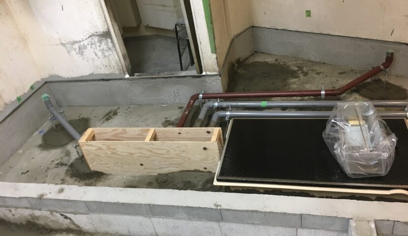 神奈川県横浜市某店舗改装工事(厨房、グリストラップ設置及び配管工事)スケルトン状態の神奈川県横浜市某店舗厨房区画にまずはグリストラップを設置(プレパイ工業超浅型グリストラップTOSC-840側溝流入式)