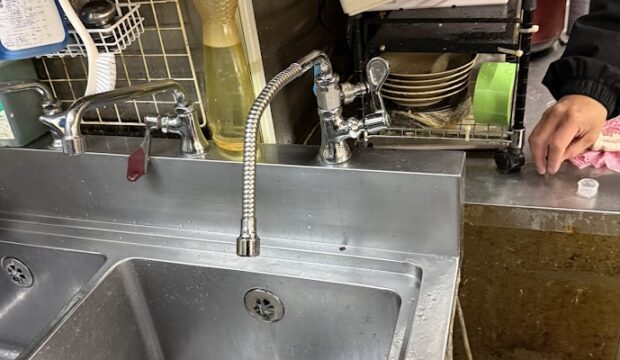 大阪府大阪市中央区某店舗サンエイ厨房用立形自在水栓本体A5310F-13ベンリー自在パイプPA18A-76X3-16切替コック(自在水栓用)PU6-63F-13交換工事